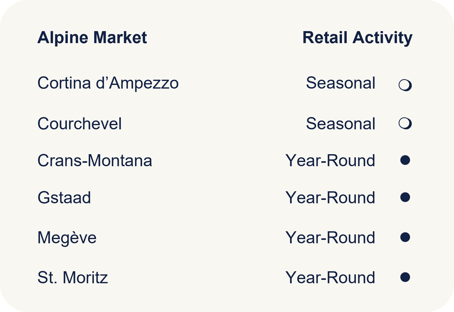 Cortina remains a bi-seasonal destination, with activity concentrated around the winter and summer peaks. This more compressed trading profile makes the recent wave of flagship investment particularly significant.